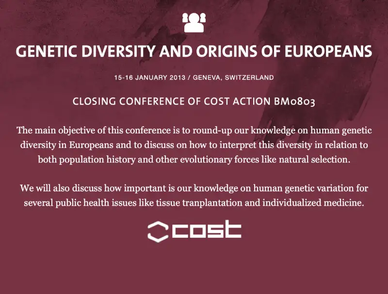 The main objective of this conference is to round-up our knowledge on human genetic diversity in Europeans and to discuss on how to interpret this diversity in relation to both population history and other evolutionary forces like natural selection.