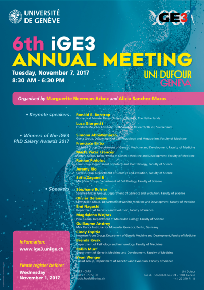 6th Annual Meeting of iGE3 7 novembre 2017 Évènement Conférence Organisé par Marguerite Neerman-Arbez et Alicia Sanchez-Mazas.